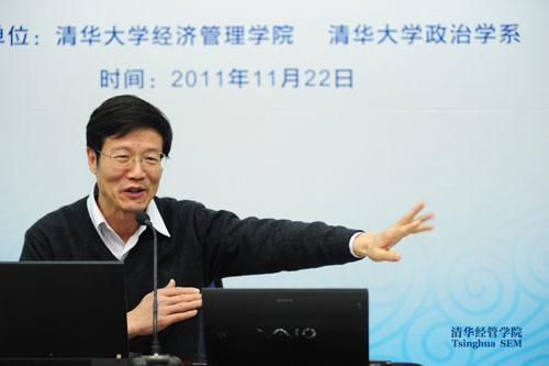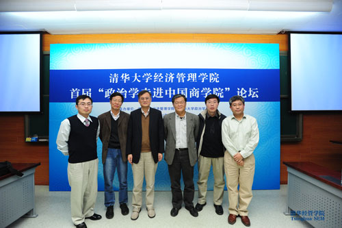 11月22日下午,由清华大学经济管理学院和清华大学政治学系联合举办的首届“政治学走进中国商学院”论坛在清华经管学院举行。经管学院院长钱颖一教授和清华大学政治学系系主任张小劲教授分别致辞,清华大学政治学系多位知名学者发表学术报告。论坛由清华经管学院副院长白重恩教授主持。