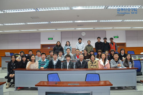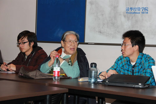 董新保教授为大家充满感情地描述了他眼中的朱镕基院长。他从三方面重点谈了自己的感受。首先,朱镕基最鲜明的特征就是一位坚定不移的改革者;第二,朱总理全心全意为人民服务,是真正的人民公仆;第三,朱镕基对经管学院的成立与壮大都给予了很多的领导、支持和帮助。董老师的讲话感情充沛、见解深刻,极富感染力,展现出老一辈清华人独特的精神风貌,多次赢得在场同学的掌声。讲话结束之后,董老师与各位同学进行了交流互动。