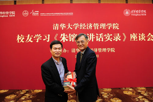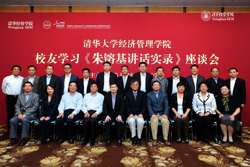 随后,上海市金融服务办公室主任方星海(经1981)、金石投资有限公司董事总经理杨宏儒(经1981/经硕1986/经博1989)、清华经管学院市场营销系主任赵平教授(经博1987)、诺德基金管理有限公司总经理潘福祥(经1983/经硕1988)、北京科鼎隆科技发展有限公司总经理刘俊林(EMBA2005)、泰达国际控股(集团)有限公司党委副书记、总经理金荦(经1987/经博1998)、中国电子信息产业集团有限公司外部董事张晓铁(经硕1987)、中国建设银行金融市场部副总经理王勇(经1987/经硕1992)、中文在线总经理童之磊(MBA1998)、搜房控股有限公司董事长莫天全(经硕1986)、对外经济贸易大学金融学院宋国良教授(经硕1991)、北京国通创安报警网络技术有限公司董事副总经理何江(EMBA2008)、中国中纺集团公司人事行政部副总经理刘硕(EMBA2011)、瑞银证券有限责任公司品牌管理董事刘旭(经硕1995)、山东电力工程咨询院院长盖其庆(EMBA2005)等经管学院校友代表相继在座谈会上发言。大家表示,《朱镕基讲话实录》内容丰富,语言生动,文风朴实,充分体现了朱院长讲真话,办实事的风格,全面展示了他直面问题的勇者作风、抓住主要矛盾解决复杂问题的高超艺术,真实刻画了有血有肉的总理形象。校友们无论是就读期间直接聆听过老院长的教诲,还是慕老院长之名来到经管学院学习,对朱镕基老院长的感情都极为深厚,充满了崇敬之情。