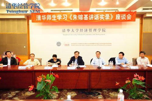 9月22日上午,清华师生学习《朱镕基讲话实录》座谈会在经管学院举行。人民出版社社长黄书元、清华大学副校长谢维和教授、清华大学经济管理学院院长钱颖一教授、清华经管学院师生代表和媒体记者参加了会议。此次座谈会由清华经管学院院长钱颖一主持并做开场致辞。黄书元社长、谢维和副校长、经管学院的离退休及在职教职工代表,以及本科、硕士、博士及MBA、EMBA项目学生代表相继发言,交流读书感想和体会,气氛隆重而热烈。