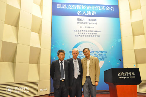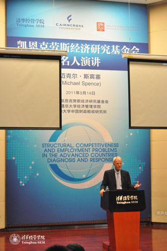9月14日下午,“凯恩克劳斯经济研究基金会名人演讲”在清华大学经管学院举办,2001年诺贝尔经济学奖得主迈克尔·斯宾塞(Michael Spence)发表了题为“发达国家的结构、竞争和就业问题:诊断与应对”的演讲。凯恩克劳斯经济基金会项目主任林至人博士与清华经管学院院长钱颖一教授先后致辞,活动由副院长白重恩教授主持。凯恩克劳斯基金会现任理事、原福特基金会首任驻华代表彼得·盖特纳等嘉宾到会。本次演讲吸引了在京的多所大学与研究机构、政府部门、金融机构、新闻媒体及其他组织的三百余名听众。