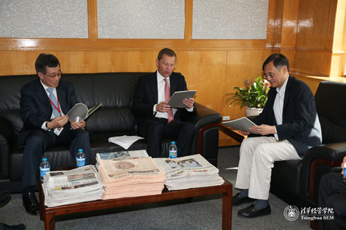 清华大学经济管理学院院长钱颖一教授(右)向瑞银财富管理首席执行官Jürg Zeltner(左一)及瑞银集团(UBS)中国区主席兼总裁李一介绍学院概况