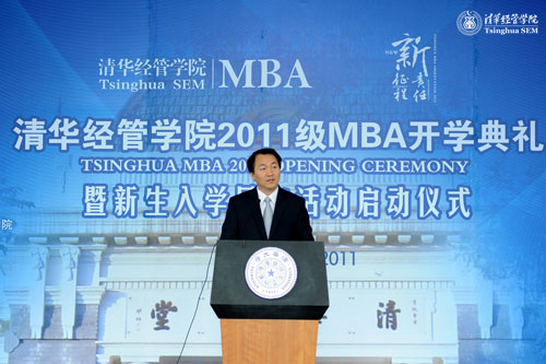 开学典礼由清华经管学院院长助理高建教授主持。清华经管学院院长钱颖一教授首先致辞,他热烈欢迎2011级的同学加入清华MBA大家庭,并在讲话中谈到,清华MBA至少在以下三个方面在中国MBA教育中发挥了引领作用: