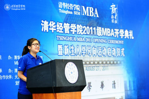 随后,由2011年新生入学导向活动筹备组代表,2010级I2班MBA学生任玥致辞。任玥同学提出,清华MBA不仅是一种荣誉,更是一份责任。同学们有幸经历了清华百年,中国MBA20年,并将成为一段新征程的开启者。她希望同学们走在通往成功的道路上,将“责任”二字永放心间。