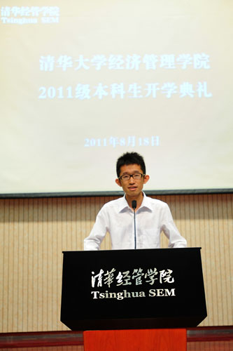 代表新生致辞的是经16班李海石。不约而同,李海石也提到了“选择”。他说,加入清华经管学院最重要的理由,是因为这里是培养经济管理人才的殿堂。这不仅是学业上的选择;更是人生的一次重要选择,选择“做第一等的事业” , “做中国的脊梁”。