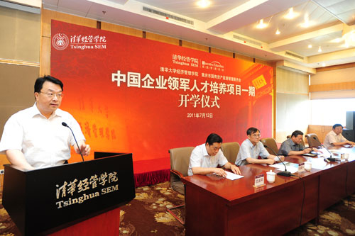 7月11日,经过长期、周全的筹备工作,由清华大学经济管理学院开创设计的“中国企业领军人才培养项目”重庆班首期的开班仪式在学院舜德楼举行。这是清华经管学院在整合清华优质教育、师资资源的基础上,与重庆市政府共同开展的企业高端人才培养项目。清华大学副校长程建平,清华经管学院院长钱颖一,清华大学教育培训管理处处长邓丽曼,清华经管学院副院长夏冬林,清华经管学院教授、项目导师组组长陈章武,与重庆市政府副秘书长、重庆市国资委主任崔坚,重庆市国资委党委副书记罗聪,以及项目领导小组和项目联络组的领导参加了开班仪式,仪式由清华经管学院高级管理培训中心主任薛镭主持。