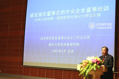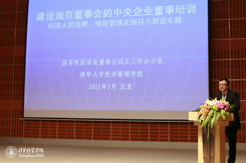 2011年5月11日上午,国务院国资委“建设规范董事会的中央企业董事培训”正式启动。国务院国资委邵宁副主任,国务院国资委改组局李冰局长、秦永法副局长,清华经管学院党委书记杨斌教授,清华大学经济管理学院公司治理研究中心执行主任宁向东教授,清华经管学院人力资源与组织行为系王雪莉教授,清华经管学院高级管理培训中心副主任刘燕欣老师出席开班仪式。