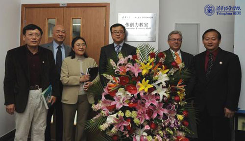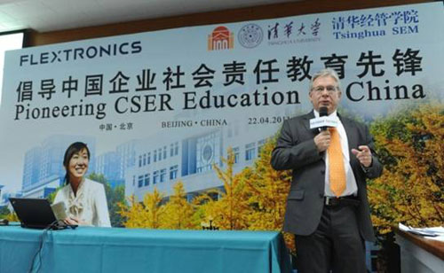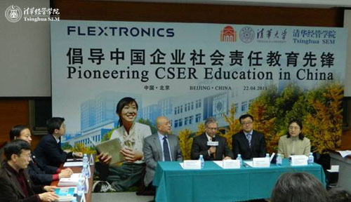 4月22日,正值清华百年校庆期间,伟创力集团(Flextronics International)宣布,与清华大学经济管理学院共同推出企业社会责任(CSR,Corporate Social Responsibility)讲席教授计划。与此同时,伟创力教室揭牌仪式和CSR专题讲座在清华经管学院举行。计划主要负责教授杨斌、钱小军、姜朋及引进企业资源的合作发展办公室主任潘庆中老师作为院方代表出席活动。