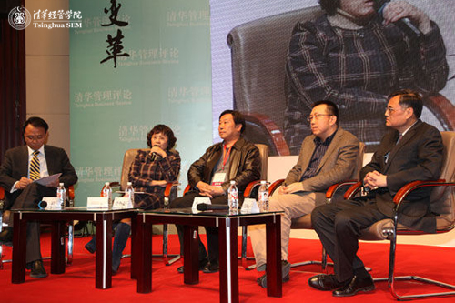 在“商学院与媒体的共融发展”论坛上,财新传媒总发行人兼总编辑、中山大学传播与设计学院院长胡舒立教授,中国传媒大学媒体管理学院院长李怀亮教授,资深媒体人何力先生,清华大学经济管理学院院长、《清华管理评论》主编钱颖一教授等四位嘉宾,共同就相关话题展开探讨。论坛由清华经管学院党委副书记朱岩教授主持。