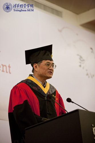 清华经管学院院长钱颖一教授为2011届毕业典礼致辞。他祝贺同学们顺利完成了颇具挑战性的多门高级商业经营管理课程,并取得优异的成绩。钱院长指出,在座的同学们已经熟悉清华的历史,也体认了清华的精神和价值观,今天成功从清华园毕业,将所学投入到人生和事业中,“清华和我,都会永远为你们而感到骄傲!”钱院长还邀请同学们参加今年四月母校的百年校庆,希望他们“再回家看看”。