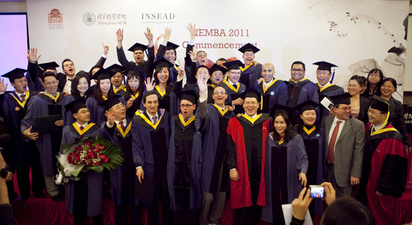 2011年1月17日下午,清华-INSEAD双学位EMBA项目(简称“TIEMBA”)2011届毕业生齐聚清华经管学院舜德楼举行毕业典礼。来自十多个国家的毕业生一一走到台前,分别从清华大学经济管理学院副院长廖理教授和INSEAD EMBA项目院长哈维尔•吉米诺(Javier GIMENO)教授手中接过这两所世界名校的学位证书。