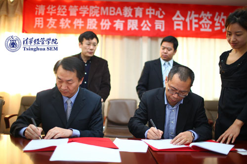 用友软件股份有限公司高级副总裁郑雨林先生和清华经管学院院长助理高建教授出席合作签约仪式并签署合作备忘录,双方希望在MBA奖学金、课程开发、开放式课堂、招聘合作等方面进行深入合作。