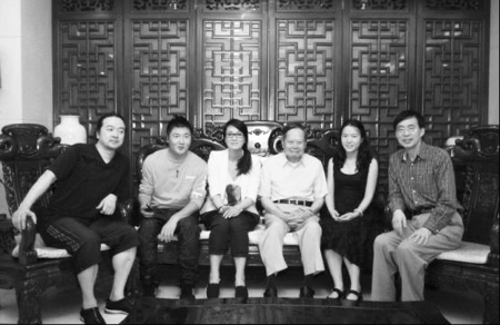 会歌主创人员合影。从右至左:词作者徐荣凯,翁帆、杨振宁夫妇,会歌演唱者毛阿敏与孙楠,曲作者捞仔