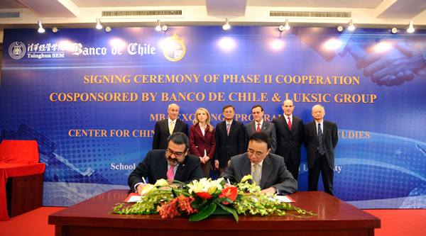 10月22日,“清华大学-智利天主教大学”合作项目第二期签约暨“中国与拉美管理研究中心”成立仪式在清华经管学院举行。清华经管学院顾问委员会委员、智利卢克希奇集团主席、智利银行副总裁安东尼克·卢克希奇(Andrónico Luksic)先生,智利银行首席执行官Arturo Tagle先生,智利天主教大学校长Ignacio Sanchez教授,清华大学副校长谢维和教授,清华经管学院院长钱颖一教授等出席仪式并致辞。签约仪式由清华经管学院副院长陈国青教授主持。