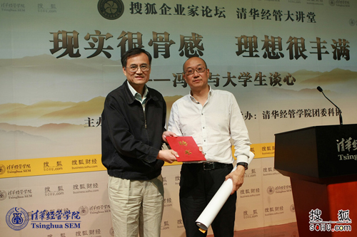 最后,钱颖一院长为冯仑先生颁发了清华经管学院演讲聘书,搜狐网财经中心总监史彦先生为其颁发了“搜狐企业家论坛理事”聘书。