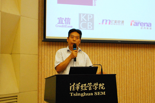 清华经管学院MBA教育中心主任高旭东教授致欢迎辞,并和大家分享了自己对于创新的理解。高旭东教授说,从我国经济发展的经验来看,坚信西方理论,采取“引进—消化—吸收”模式的企业,发展往往不太顺利;而那些从一开始就坚持自主创新的企业,经过数十年的发展,反而可以登上国际竞争舞台。例如,中国的电信设备产业已跻身全球前列,华为目前的市场份额已位居世界第二,并且有望超越爱立信,成为世界第一。高旭东教授建议,培养创新能力最有效的方法,是与真正有创新能力的人交流,向他们学习。