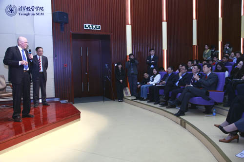会谈结束后,鲍尔森先生来到清华经管学院伟伦楼国际报告厅发表演讲。清华大学副校长谢维和教授主持了本次演讲。他回顾了鲍尔森先生与清华大学,尤其是清华经管学院的深厚友谊,重点重温了2006年9月鲍尔森先生访华时赴清华大学与师生进行座谈时的情景。