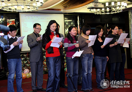 清华经管学院真可谓人才辈出、卧虎藏龙。吴维库教授清唱的《乌苏里船歌》曲调悠扬;EDP工会小组的舞蹈《剪纸姑娘》服装艳丽;教学、MBA工会小组表演的方言三句半令人忍俊不禁;还有金融系工会小组的合唱《青春舞曲》、离退休教授代表董新保教授倾情演绎的英文歌曲《老黑奴》、各系教授们的歌曲联唱都赢得大家的阵阵掌声;由EMBA工会小组表演的男女声情歌对唱《广岛之恋》则极具专业水准;最后,由陕西籍教授们演唱的陕北民歌《山丹丹开花红艳艳》和机关二组工会小组表演的舞蹈《千年等一回》以一种幽默的方式全新演绎了两首传统的歌曲,联欢会在一片欢声笑语中结束。