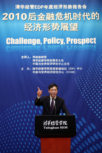 11月27日下午,题为“2010后金融危机时代的经济形势展望”的年度经济形势报告会在清华经管学院国际报告厅举行。本次报告会由清华经管学院高层管理培训(EDP)中心联手清华大学中国与世界经济研究中心(CCWE)共同举办,清华经管学院金融系主任、中国与世界经济研究中心主任李稻葵教授担任报告会主讲人。
