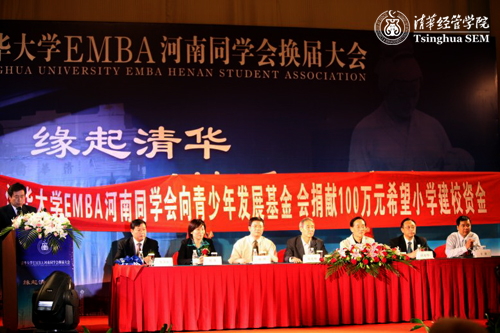 2009年9月17日,清华大学EMBA河南同学会换届暨捐赠希望工程大会在郑州举行。会议选举产生了新一届同学会理事会成员,并集体筹资向河南希望工程捐赠100万元,在河南省南阳市援建一所希望小学,同时为1000名大学生提供就业岗位。清华经管学院副院长、EMBA项目主任廖理教授,河南省人大原副主任、清华经管学院校友贾连朝,河南省人大预算工作委员会原主任、清华大学河南校友会会长孙光华,共青团河南省委副书记侯红等出席大会并发表讲话。