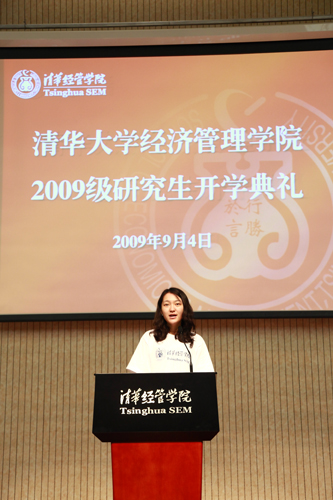 新生代表邹静的发言真挚朴实。她说:“作为清华经管学院的一名研究生新生,我们幸运地搭乘上历史机遇的快车。我们需要做的,是在接下来的研究生生活中,以追求卓越的清华品格作为对自己的最高要求,努力提高业务素养,锻炼综合能力,以期在不久的将来,肩负起历史赋予的使命,为中国的经济建设添砖加瓦。”