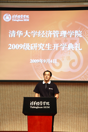 9月4日下午2时,清华大学经济管理学院2009级研究生开学典礼在伟伦楼国际报告厅隆重举行。院长钱颖一,党委书记杨斌,副院长陈国青、夏冬林,党委副书记朱岩、赵冬青,院长助理高建等领导和老师出席典礼,与2009级研究生新生共同见证了这一难忘时刻。典礼由副院长白重恩主持。