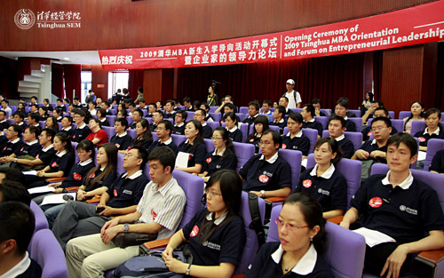 9月12日下午,以“行健自强”为主题的2009年清华大学MBA新生入学导向活动(Orientation)暨企业家的领导力主题论坛,在清华经管学院国际报告厅隆重举行。学院党委副书记朱岩,MBA教育中心相关负责老师,09新生入学导向活动筹备组核心成员及同学会主要成员,赞助企业代表、北京四达时代软件技术股份有限公司总裁庞新星,与400余名2009级MBA新生共聚一堂,共庆这一时刻。
