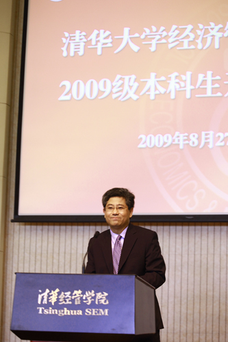 最后,钱颖一院长发表了重要讲话。他首先向全体新同学表示欢迎和祝贺,并表示:“同学们在今年进入清华大学是幸运的,因为这意味着你们在大学二年级的时候将亲历清华的百年校庆;同学们在今年进入清华经管学院更是幸运的,因为从你们年级开始,学院将推行新的本科生培养方案。”