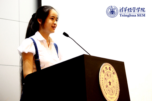 接下来,本科毕业生代表魏华同学致辞,她回忆了大学四年的美好时光:冬情晚会,马约翰杯,海外交换,暑期社会实践……一个个片断串接成经管本科四年难忘的时光。“在经管的每一天,在被如此丰富的资源与机会包围的日子里,我始终害怕自己错过了些什么……我抓紧每一寸光阴,尽力用更多的体验,更多的故事,来丰满自己的羽翼”;“毕业,不是结束,而是开始,它将不断提醒着我们秉承和发扬清华精神,敢于担当,它将陪伴着我们去开创属于我们的每个人的未来”。