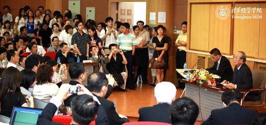 晚7时,401阶梯教室座无虚席,甚至连门口和过道上都站满了人。清华各院系师生、闻讯赶来的企业家、业界人士共300余人聆听了这一演讲。本次讲堂活动由清华大学国际合作与交流处、清华经管学院领导力研究中心和湛庐文化共同主办。中国企业联合会常务副理事长胡新欣、湛庐文化董事长兼总编辑韩焱女士等出席了本次活动。活动由清华经管学院党委书记、领导力研究中心主任杨斌主持。