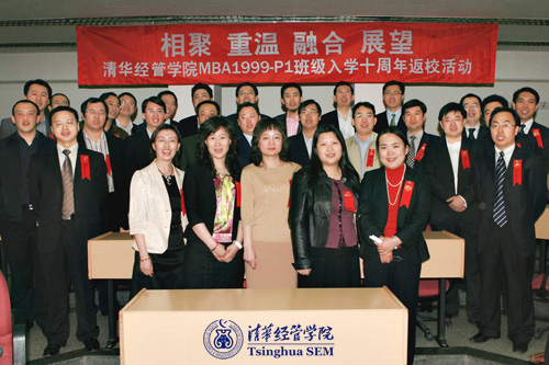 2009年,是学院MBA1999-P1班级入学10周年的日子。3月份,班级同学就开始策划返校活动并群策群力、积极准备。4月25日,这一愿望终于实现。34名同学齐聚当年上课的伟伦楼501教室,举行“相聚 重温 融合 展望”主题班级活动,分享10年感悟,重温同学友谊。