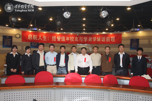 院党委副书记陈章武教授、市场营销系主任赵平教授也来到现场与校友们亲切座谈。陈章武老师说,清华经管学院自1998年招收首届经贸委班以来,面向企业在职员工,采用考试与推荐相结合的选拔方式,为国家培养了众多出色的经管人才与商界精英。赵平老师感慨时光流逝,对校友们在各自岗位上取得的成就感到非常欣慰,他衷心祝愿校友们顺利如意。中国电信集团公司的刘晖平校友主持活动,并现场朗诵了自己的诗作。