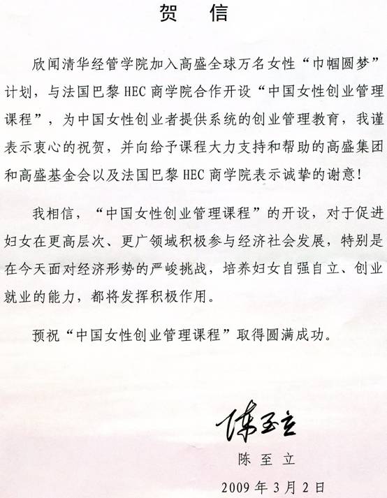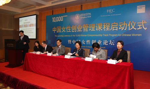2009年3月2日下午,“中国女性创业课程”启动仪式暨中国女性创业论坛在清华经管学院举行。全国妇联副主席书记处书记甄砚同志出席本次活动,并宣读全国妇联主席陈至立的贺信并转达了陈至立主席对该课程启动的祝贺。清华大学党委副书记韩景阳教授表示,“清华大学一直致力于成为培养人才的重要基地,在人才的培养模式方面不断摸索和创新”,希望“‘中国女性创业管理课程’的举办能为中国女性的创业管理教育提供新思路和新方法”,为扶持更多有创业意识的女性人才,更好地解决女性的就业和发展问题方面提供有益的探索和尝试。清华大学经济管理学院院长钱颖一教授表示:“ 清华经管学院是国内首个为MBA学生开设“创业管理课程”的商学院,并在2000年成立了清华大学经济管理学院中国创业研究中心,在中国创业教育与研究方面处于领先地位。巴黎HEC商学院在创业管理教育方面也早已享有盛名。‘中国女性创业管理课程’的推出,是中法两国商学院在这一领域的首度合作,在教学模式、手段、内容上都有改革和创新。”。