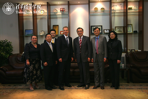 (清华大学副校长谢维和[右三]、清华经管学院院长钱颖一[右二]等与布莱尔[左四]合影)