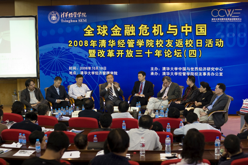 10月18日,清华经管学院迎来了一年一度的校友返校日。当天下午,一场主题为“全球金融危机与中国”的论坛在学院舜德楼401教室举行。该论坛由清华大学中国与世界经济研究中心和清华经管学院校友事务办公室共同主办,这也是中国与世界经济研究中心举办的“改革开放三十年”系列论坛的第4期,吸引了300多位清华经管学院校友前来参加。论坛由中国与世界经济研究中心主任、清华经管学院金融系主任李稻葵教授主持。