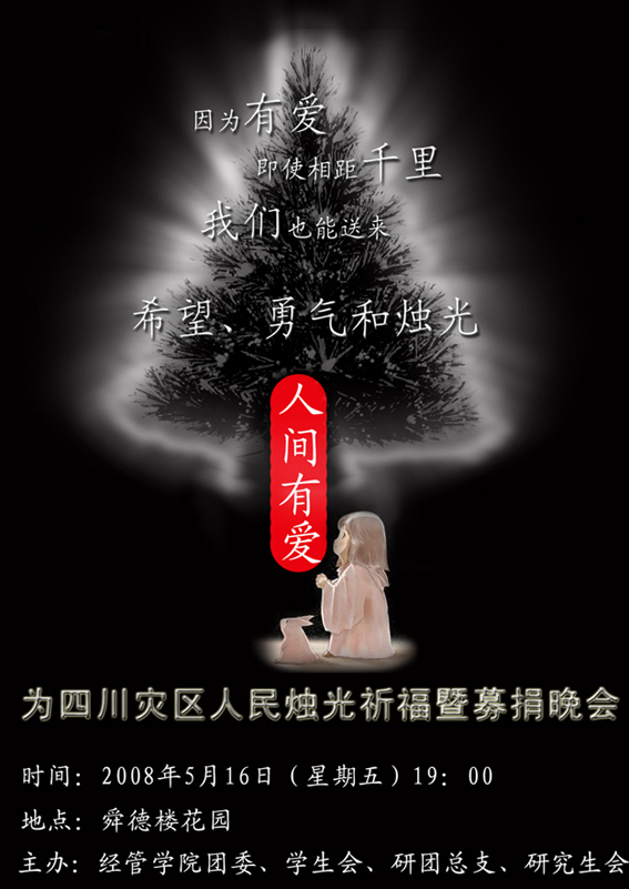 5月16日(周五)晚19时,经管本科、研究生的团委、学生会联合组织“人间有爱——为地震灾区人民祈福暨募捐”特别晚会,在伟伦楼、舜德楼间花园为灾区人民送上我们的祝福与问候。希望大家可以一同来支持这次活动,你的祝福,灾区人民感受得到!