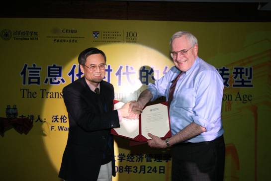 3月24日,哈佛商学院IT教学创始人、贝克基金教授沃伦·麦克法兰(F. Warren McFarlan)博士来到北京,开启了2008中国奥运年的又一次中国行,并以《信息化时代的组织转型》为题,在北京、深圳、上海举行巡回演讲,再次为推动中美教育和学术交流做贡献。