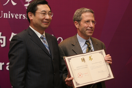 (胡和平副校长为马斯金教授颁发名誉教授聘书)